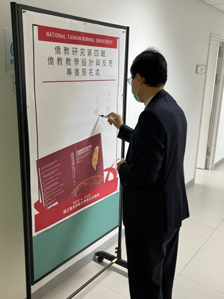 僑先部特別於110年11月4日上午8時40分舉辦《僑教研究第四輯:僑教教學設計與反思》新書發表會,當日適逢僑先部辦理「2021亞洲青年教育發展論壇-後疫情時代的數位學習研討會」,當日邀請到本校張國恩教授、宋曜廷副校長、印永翔副校長等多位師長一同參與發表會,於會前,請師長們於新書海報上簽名,除共同見證新書發表的這一刻外,亦象徵著臺師大多年來在僑生教育領域所累積豐厚之教學能量。